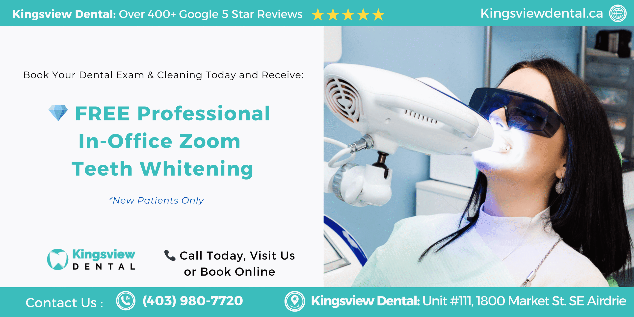 At Kingsview Dental, we’re excited to welcome new patients with a special offer designed to help you start your dental care journey with confidence. When you book a dental exam and professional cleaning, you’ll receive a free in-office Zoom teeth whitening, helping you enjoy a healthier, brighter smile from your very first visit.